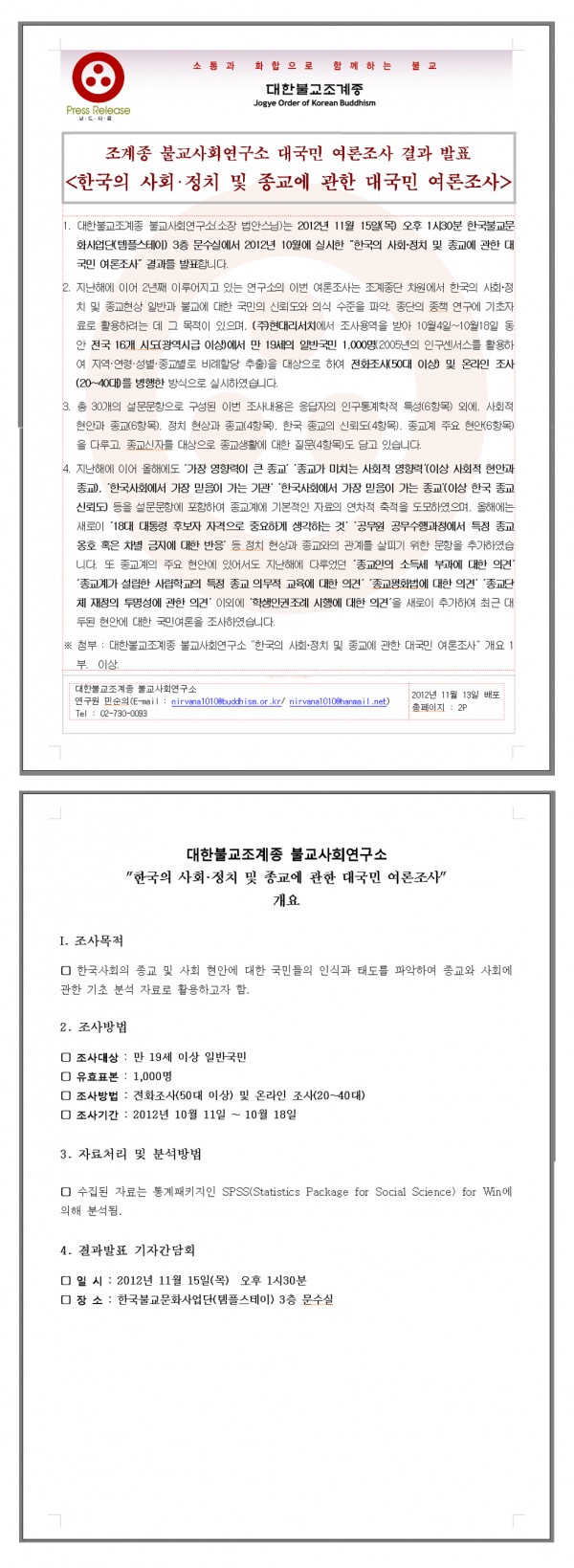 - [보도자료] 불교사회연구소 여론조사결과 발표2012.11.15.hwp (457.5K) 35회 다운로드 | DATE : 2018-12-21 15:34:46
