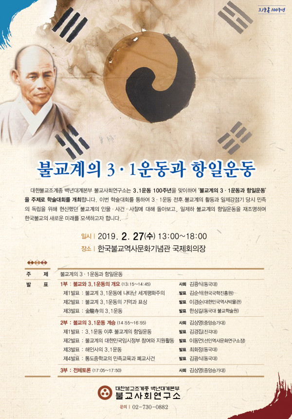 ‘불교계의 3·1운동과 항일운동’ 학술세미나 개최 안내 페이지 정보 작성자 관리자 댓글 0건 조회 3,033회 작성일 19-02-20 16:28 본문 담당 : 민순의 연구원(02-730-0882) 목록 이전글"불교계의 3·1운동과 항일운동(5)" 학술세미나 개최 19.03.07 다음글[보도자료]‘불교계의 3·1운동과 항일운동’ 학술세미나 개최 19.02.20 댓글목록 댓글목록 등록된 댓글이 없습니다.