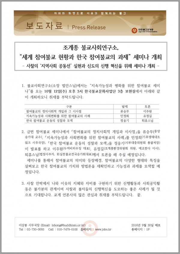 [보도자료]“세계 참여불교 현황과 한국 참여불교의 과제” 세미나 안내