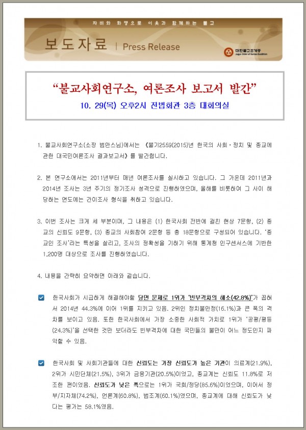 [보도자료]불교사회연구소, 여론조사 보고서 발간